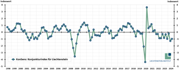 Im Kontext der unsicheren Weltwirtschaftssituation und der lahmenden globalen Aussenhandelsentwicklung bleibt Liechtensteins Konjunktur weiterhin in schwachem Terrain. Der Wert des Konjunkturindexes KonSens stieg im 3. Quartal 2024 nur leicht an, von −1.3 auf −1.0.