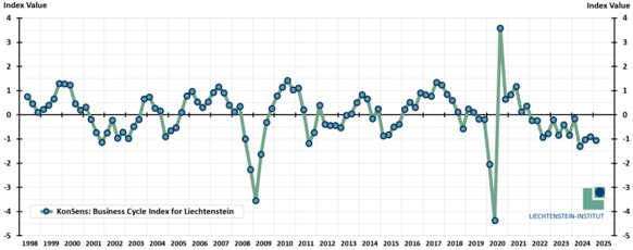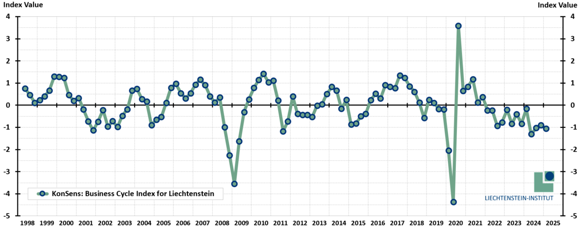 Rising uncertainty in the global economy continued to weigh on international trade, contributing to ongoing weakness of Liechtenstein’s business cycle. The value of the KonSens business cycle index slightly fell in the 1st quarter of 2025 to −1.1, as Liechtenstein’s foreign goods trade remained sluggish and the company survey data were subdued.