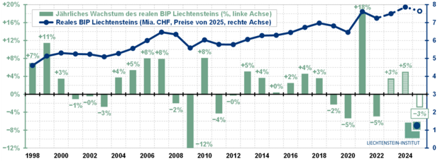 Liechtenstein’s economic output, as measured by real gross domestic product (GDP), declined in 2025—a year marked by U.S. tariffs—and thus failed to sustain the surprisingly positive trend of the previous two years. According to the Liechtenstein Institute’s estimation model, nominal GDP in 2025 amounts to approximately CHF 7’641 million. Based on the nominal GDP for 2024 from the preliminary estimate published by the Office of Statistics, the estimation model projects a nominal GDP growth of approximately −3% for 2025. Due to low inflation, the real GDP growth rate for 2025 is only slightly lower, also rounding to −3%.