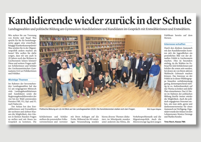 Kandidierende wieder zurück in der Schule. Article by Timo Frick in the Liechtensteiner Vaterland, January 25, 2025
