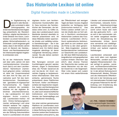 Das Historische Lexikon ist online. Digital Humanities made in Liechtenstein. 19 Nov 2018 - Notification Gastkommentar von Fabian Frommelt in der Lie-Zeit Nr. 70, November 2018. Publications on this Topic Frommelt, Fabian (2018): Das Historische Lexikon ist online. Digital Humanities made in Liechtenstein. Gastkommentar. Lie-Zeit Nr. 70, November 2018. Current Projects on this Topic Historical Lexicon of the Principality of Liechtenstein online (eHLFL) » zur Startseite » zum Newsarchiv