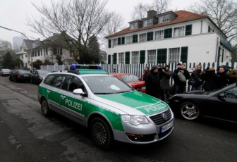 Bild: Wartende Journalisten und ein Polizeifahrzeug am 14.2.2008 vor dem Haus des Vorstandsvorsitzenden der Deutschen Post AG, Klaus Zumwinkel, in Köln (ddp).