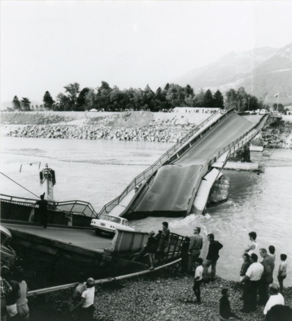 Abbildung: Die am 14. August 1970 eingestürzte Strassenbrücke Schaan–Buchs. LI LA B 12S.2/002/013, Foto: Landesarchiv / Unbekannt.