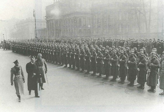 Bildlegende: Fürst Franz Josef II. schreitet während seines Berlinbesuchs 1939 eine Ehrenkompanie ab. Fotografie (LI LA).