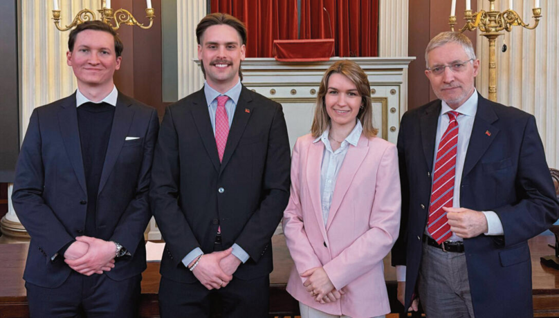 In the picture (from left) Jonas Büchel, Quentin Büchel and Julia Pfleger with Georges Baur in the Aula of the University of Oslo.
