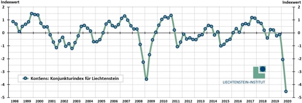 Wie bereits erwartet hat sich der Einbruch von Liechtensteins Konjunktur unter dem Einfluss von COVID-19 und dem damit verbundenen Shutdown noch verstärkt: Der KonSens ist weiter getaucht und liegt im 2. Quartal 2020 bei −4.5.