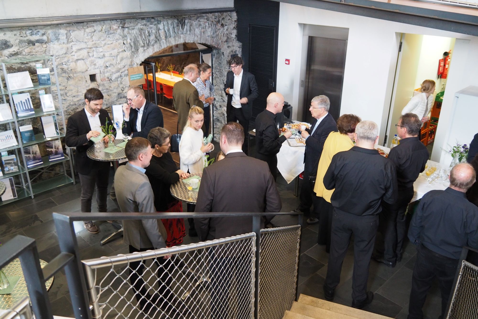 Gemeindevorsteher Johannes Hasler und Direktor Christian Frommelt begrüssten das zahlreich erschienene Publikum. Ein Kurzvortrag von Fabian Frommelt widmete sich dem früheren Bendner Zoll, welcher bis zur Schaffung der Eisenbahnlinie Feldkirch-Buchs von grosser Bedeutung war. Im Gespräch mit Emanuel Schädler ging Altvorsteher Donath Oehri auf die bewegte und langwierige Geschichte der damaligen Pfarrstallrenovation ein. Musikalisch umrahmt wurde die Veranstaltung vom Unterländer A-cappella-Quartett Vocalis.
