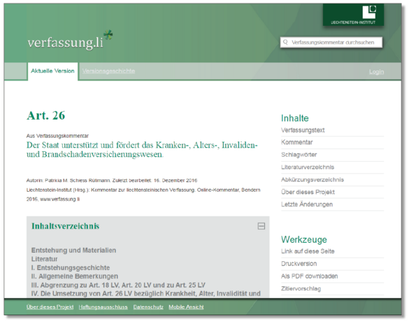 Neu sind Art. 26 LV (über die Sozialversicherungen) sowie Art. 64 bis Art. 70 LV (aus dem V. Hauptstück über den Landtag) in www.verfassung.li eingelesen und verlinkt. Sie ergänzen die bereits im Frühling und Herbst 2016 vollständig aufgeschalteten Kommentierungen zum I. und II. Hauptstück (Das Fürstentum und Vom Landesfürsten) und X. Hauptstück (Von den Gemeinden) sowie die erste Hälfte der zum III. und V. Hauptstück über die Staatsaufgaben und den Landtag publizierten Kommentierungen.