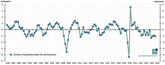 Die weiter gestiegene Unsicherheit in der Weltwirtschaft belastet den globalen Aussenhandel, so dass Liechtensteins Konjunkturschwäche anhält. Dabei hat sich der Wert des Konjunkturindexes KonSens im 1. Quartal 2025 wieder leicht abgeschwächt auf −1.1.