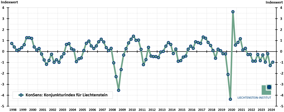 Im Kontext der unsicheren Weltwirtschaftssituation und der lahmenden globalen Aussenhandelsentwicklung bleibt Liechtensteins Konjunktur weiterhin in schwachem Terrain. Der Wert des Konjunkturindexes KonSens stieg im 3. Quartal 2024 nur leicht an, von −1.3 auf −1.0.