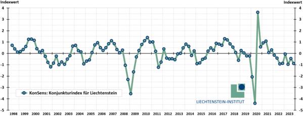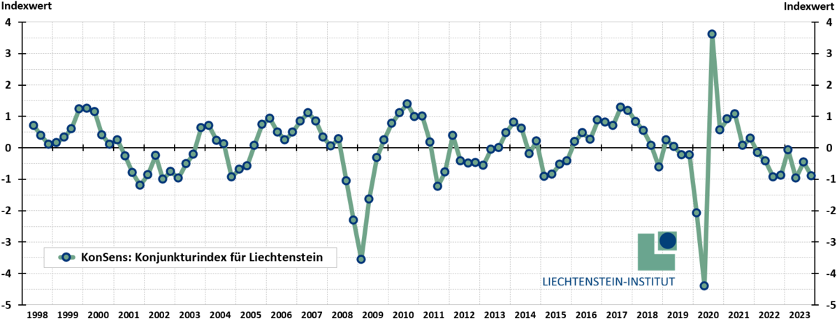 Die schon länger dauernde Konjunkturschwäche Liechtensteins hat sich weiter verstetigt. Der Wert des Konjunkturindexes KonSens sank im 4. Quartal 2023 wieder gegenüber dem Vorquartal, von −0.4 auf −0.9.