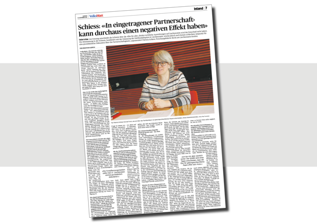 Aus Anlass der Abstimmung in der Schweiz hat das «Liechtensteiner Volksblatt» am 25. September 2021 ein Interview mit Patricia Schiess geführt. Patricia Schiess beantwortet darin die Frage, ob sich durch den Entscheid der Schweizer Stimmbürgerinnen und Stimmbürger in Liechtenstein etwas ändert und wie die Ungleichbehandlung von gleich- und verschiedengeschlechtlichen Paaren in Liechtenstein zu bewerten ist.
