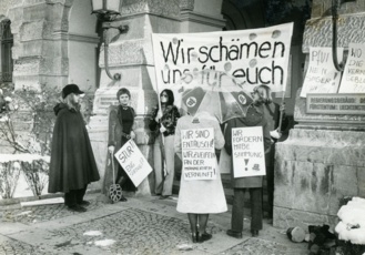 Legende: Demonstration vor dem Regierungsgebäude anlässlich der Ablehnung des Frauenstimmrechts, 5. März 1971. LI LA B 26/005/012, Foto: Landesarchiv / Peter Ospelt, Schaan.