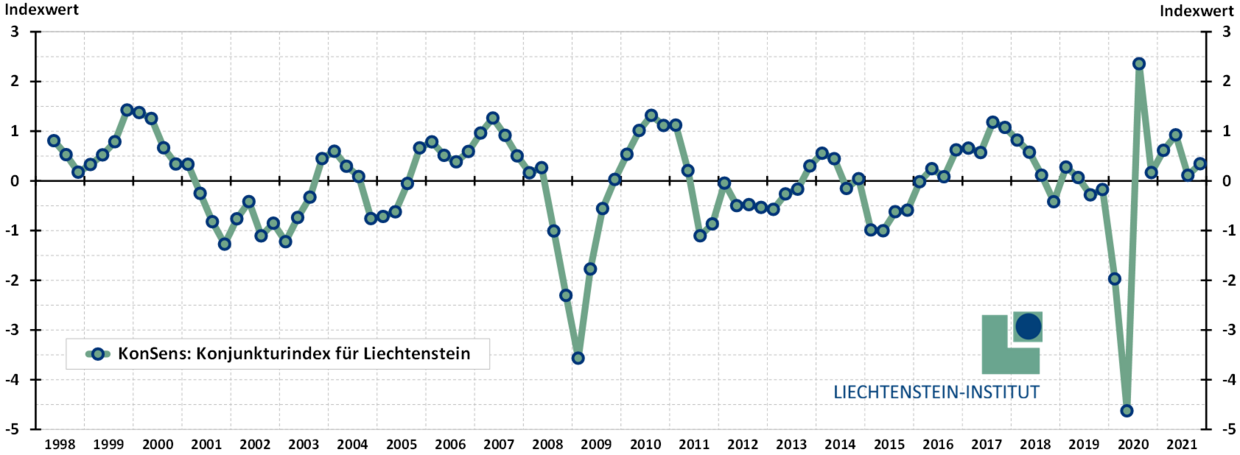 Nach einer kurzen Wachstumsverlangsamung im 3. Quartal setzte sich die Konjunkturerholung Liechtensteins im letzten Quartal 2021 weiter fort. Der KonSens hat sich von leicht über 0 auf +0.3 verbessert.