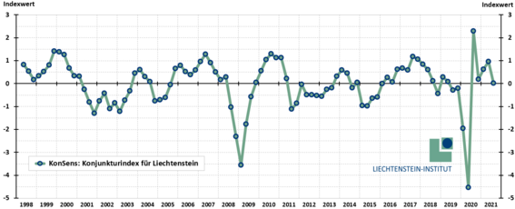 Die kräftige konjunkturelle Erholung Liechtensteins hat sich verlangsamt. Gegenüber dem 2. Quartal 2021 hat sich der KonSens dabei um etwa einen Indexpunkt auf 0.0 im 3. Quartal reduziert und zeigt damit ein historisch durchschnittliches Wachstum an.
