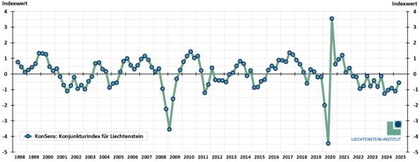 Die weltweite Unsicherheit belastet den globalen Aussenhandel weiter und damit auch Liechtensteins Konjunktur. Der Wert des Konjunkturindexes KonSens hat sich im 2. Quartal 2025 deutlich von −1.1 auf −0.6 verbessert, bleibt aber negativ.