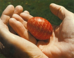 Zum Bild: Lange war es in Liechtenstein Brauch, rote, oft mit Verschen verzierte Ostereier als Liebeszeichen zu verschenken. Das abgebildete Ei schenkte Katharina Hoop ca. 1910 Pius Büchel in Ruggell. Goop: Brauchtum, S. 135 (Foto: Walter Wachter).