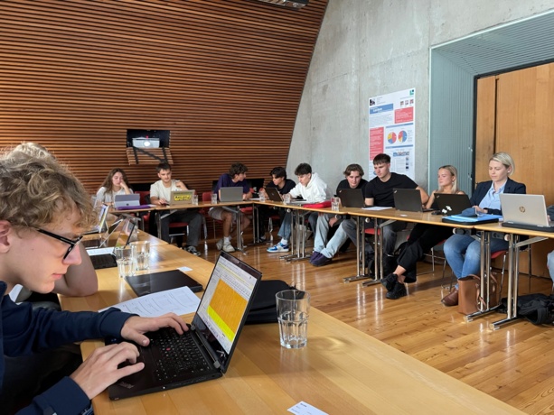 Ein weiterer Programmpunkt war eine interaktive Bibliotheksführung. Dabei wurde unter anderem das älteste Buch der Sammlung präsentiert – eine Ausgabe von Hugo Grotius’ Werk De jure belli ac pacis aus dem Jahr 1646. Eine praktische Rechercheübung vertiefte diesen Teil des Besuchs.