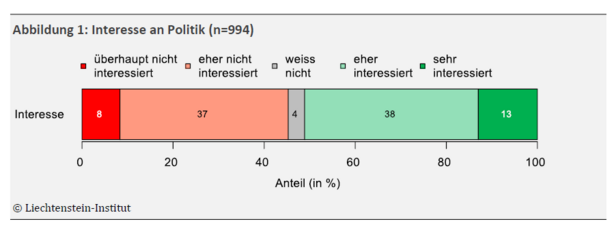 Die Jugendlichen wurden dazu befragt, in welcher Form und wie häufig sie sich politisch betätigen. Die Befragung ergab, dass sich eine kleine Minderheit junger Menschen politisch stark engagiert, während eine Mehrheit selektiv an Politik teilnimmt. Abgesehen von Diskussionen im Elternhaus bildet Instagram eine der wichtigsten politischen Informationsquellen der Jugendlichen. Politische Diskussionen unter den Jugendlichen in Liechtenstein werden meist offen geführt; nur selten getrauen sich die Jugendlichen hierzulande nicht, ihre Haltung freimütig kundzutun. Die Gründe, warum sich viele Jugendliche nicht stärker politisch engagieren, sind vielfältig: Es fehlt die Zeit, bisweilen auch das Interesse, und ausserdem haben viele andere Prioritäten als Politik.