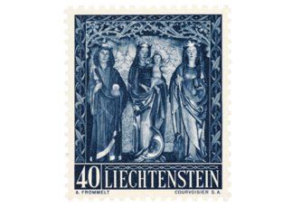 Bildlegende: Die 40-Rappen-Marke aus der Weihnachtssonderserie von 1957 zeigt den spätgotischen Flügelalter der Kapelle St. Mamertus in Triesen (heute in der Pfarrkirche St. Gallus) (Bild: https://stamps.postmuseum.li/).